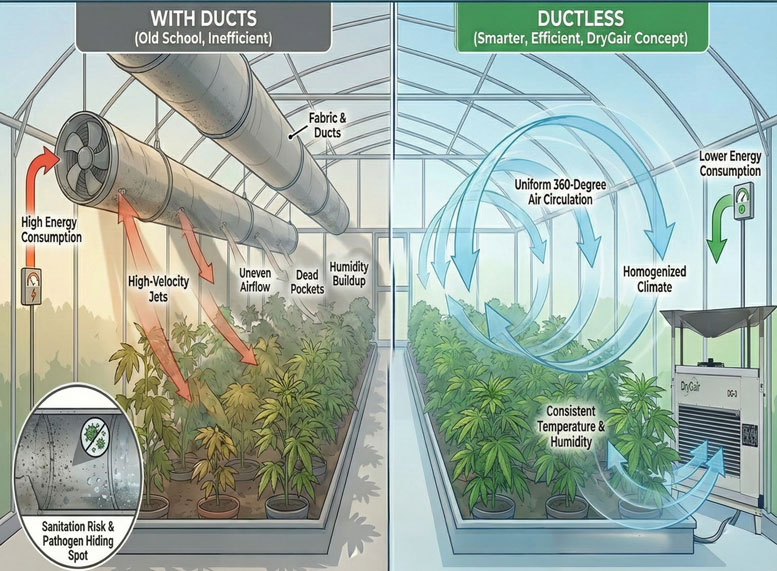 For decades, air ducts have been the default solution for distributing air in greenhouses and grow rooms. The logic seems straightforward: if air isn’t reaching the plants, add tubes to push it there.
